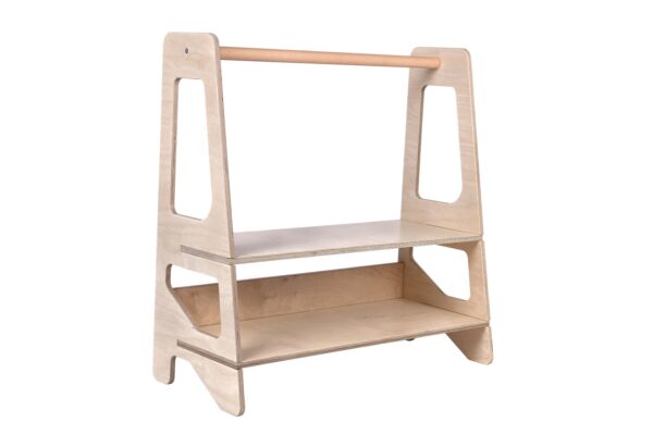 Worldwide shipping is always a challenge - even "armored" shipments can be damaged - Please check the goods with the courier - in the event of damage, request a damage report - Thanks! | The wooden ANIKA toy shelf, inspired by the Montessori method, will encourage your child to play independently and maintain order in their room, while also relieving you of the constant obligation to retrieve toys from high shelves that are out of reach of small hands. Your little one can freely decide on their activities - take out the toys they want to play with, play with them for as long as they like, and then put them back in place and reach for the next ones. Two shelves provide plenty of space for stuffed animals, puzzles, games, dolls, figures, and other items. Thanks to the increased depth, nothing falls off the shelves when placed back. It's worth complementing the toy shelf with other Montessori-style furniture.