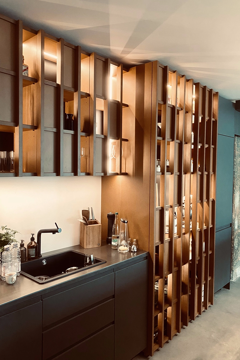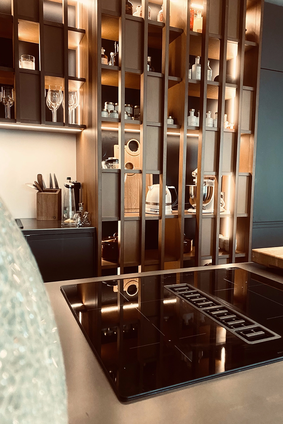 Cała zabudowa ściany została oparta o układ kratkowy przypominający klasycznego gofra. Równe podziały pionowe i poziome nadają kuchni rytm i spójność, a jednocześnie tworzą modularną przestrzeń użytkową. Niektóre „kratki” zostały w pełni zamknięte, inne pozostawiono otwarte – dzięki czemu można swobodnie eksponować eleganckie akcesoria lub ukrywać przedmioty codziennego użytku. Ten graficzny motyw nie tylko porządkuje przestrzeń wizualnie, ale również funkcjonalnie. Każdy element ma swoje miejsce, a kuchnia zyskuje niepowtarzalny, geometryczny charakter.