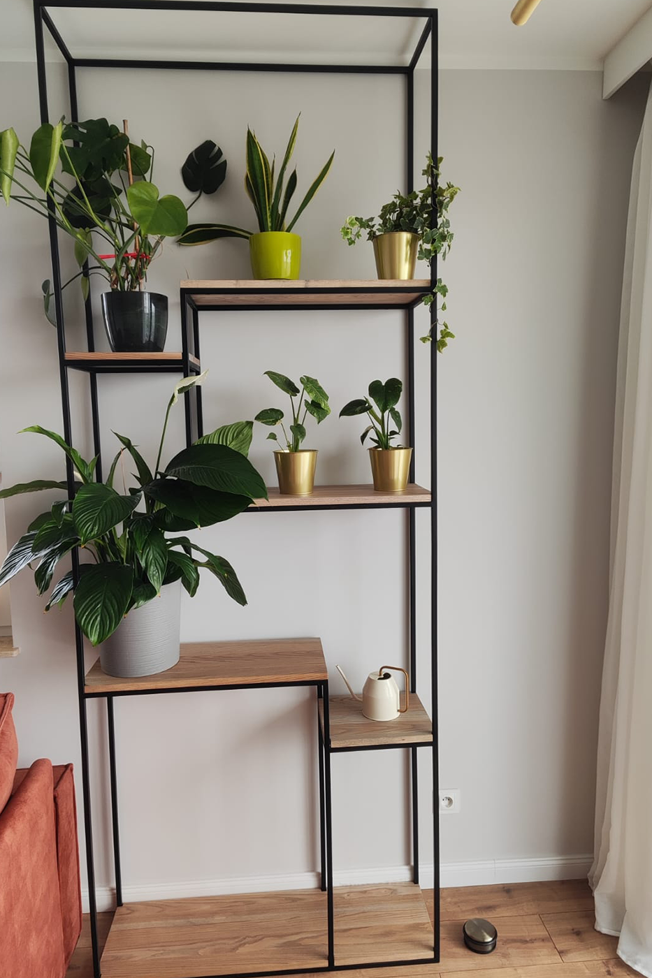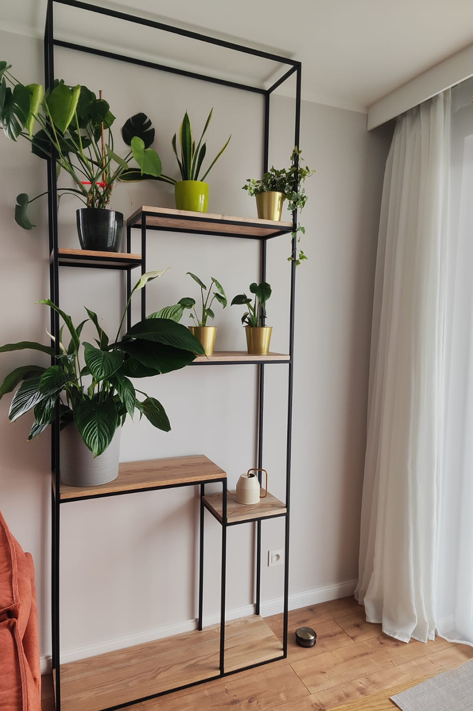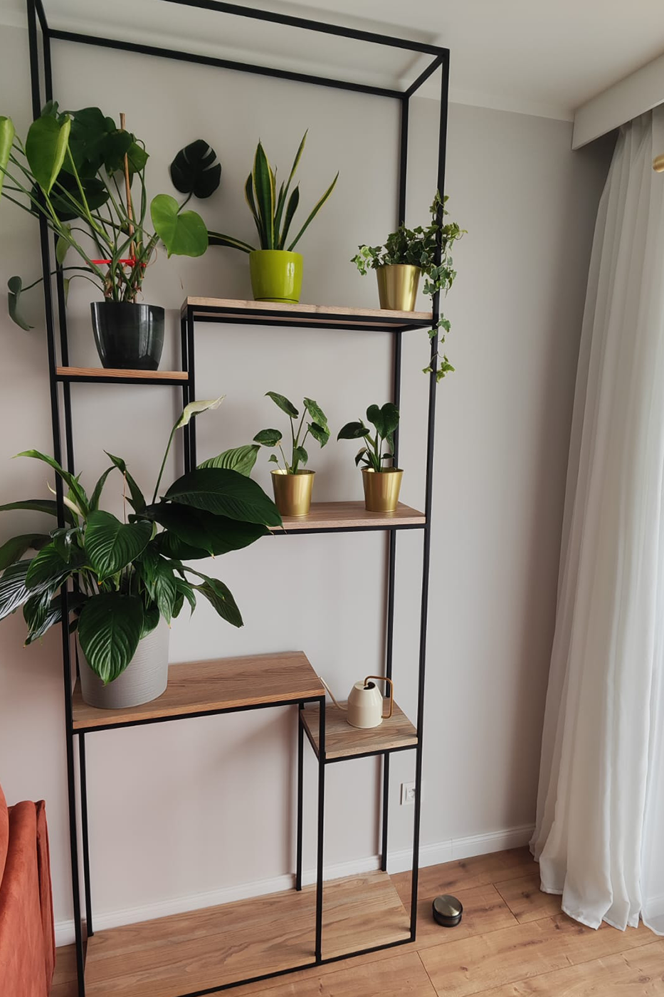 W tej realizacji stworzyliśmy nowoczesny i wyjątkowo subtelny kwietnik, który pełni jednocześnie funkcję dekoracyjną i użytkową. Projekt zrealizowany został dla klientki z dzielnicy Jasień w Gdańsku, w jasnym, przestronnym wnętrzu z dużą ilością naturalnego światła. Konstrukcja oparta została na solidnym, czarnym stelażu stalowym malowanym proszkowo, co nadaje jej industrialny, a zarazem lekki charakter. Półki wykonane z drewna o naturalnym rysunku słojów wprowadzają ciepło i równowagę, idealnie kontrastując z geometryczną formą metalu.