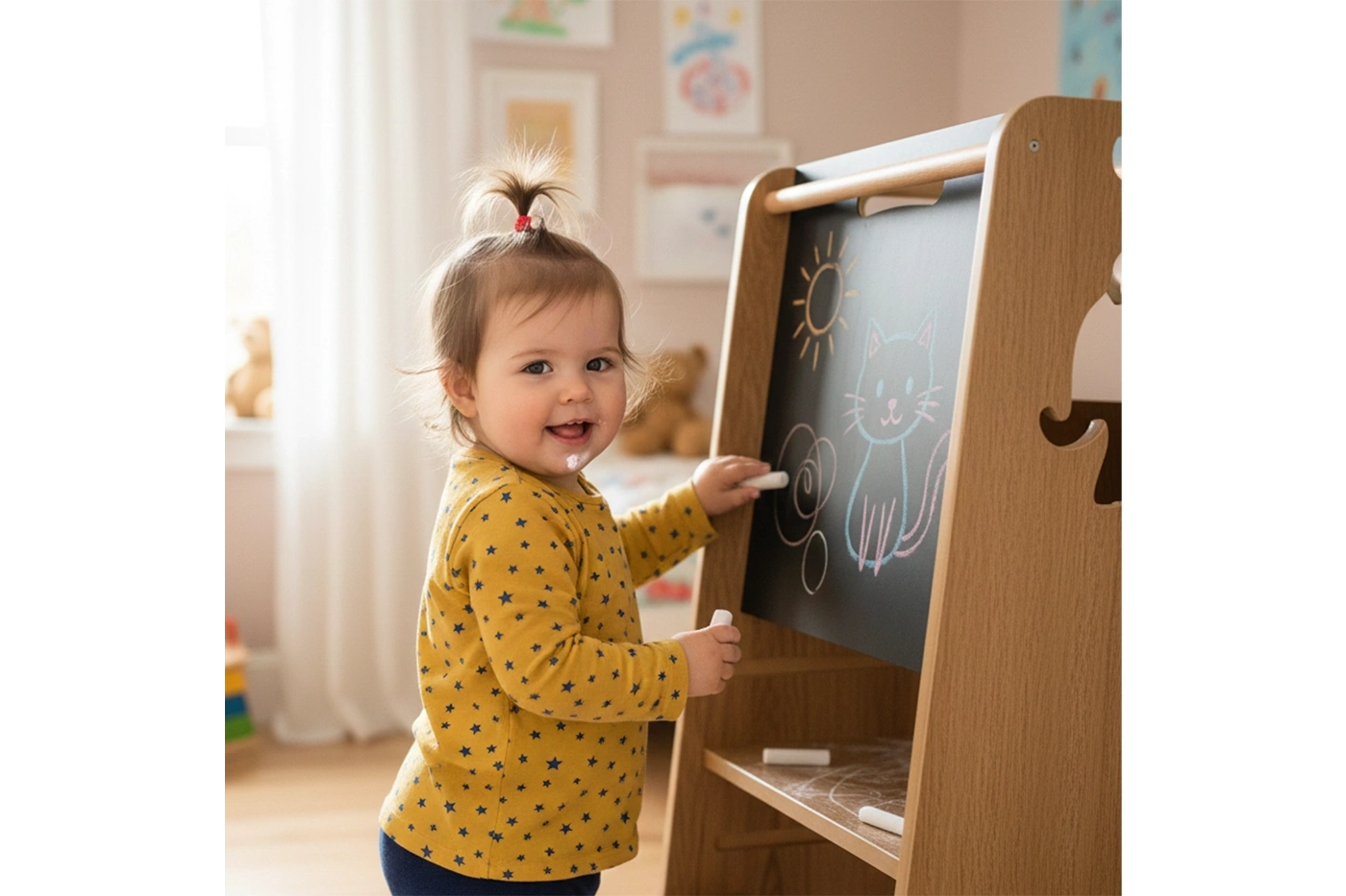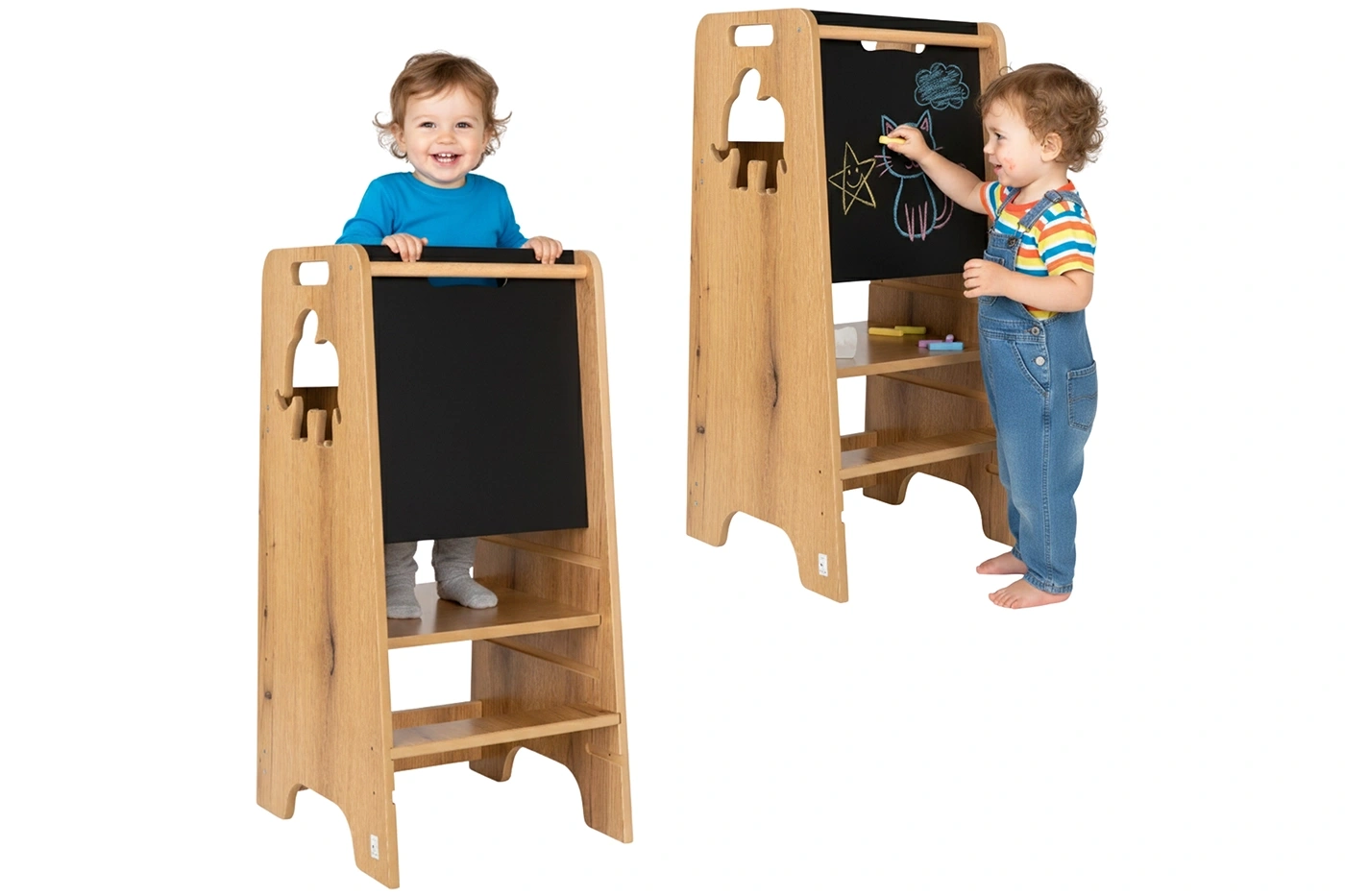 Ten pomocnik kuchenny Montessori to połączenie funkcji edukacyjnych z zabawą. Solidna konstrukcja i wysokie barierki ochronne zapewniają pełne bezpieczeństwo dziecka, eliminując ryzyko upadku do tyłu czy na boki. Tablica do pisania kredą to dodatkowy atut – maluch może rysować i pisać, co czyni czas spędzony w kuchni jeszcze bardziej interesującym.