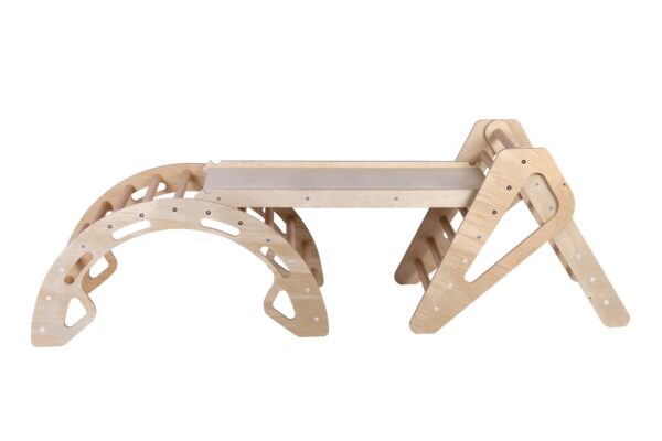 Aby urozmaicić zabawę, drabinkę można szybko przekształcić w zjeżdżalnię, a łuk wspinaczkowy w huśtawkę.